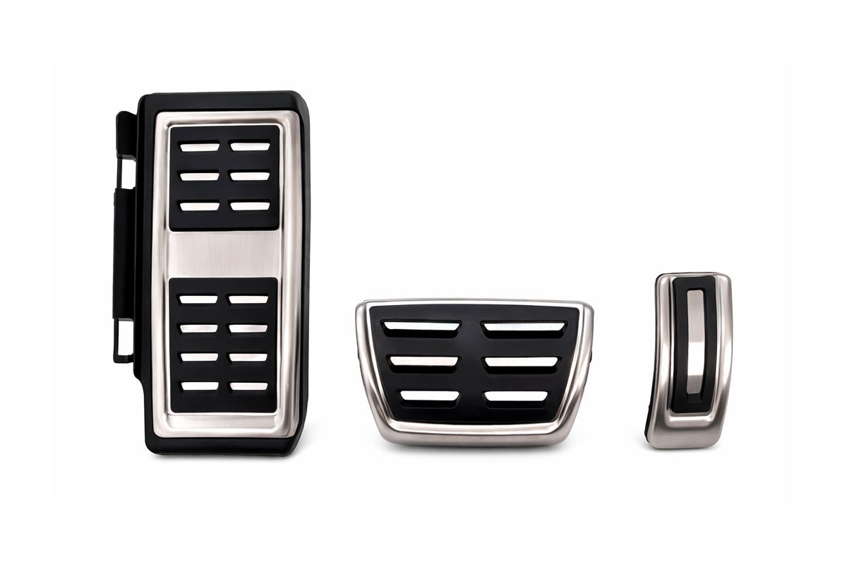 Športové kryty pedálov určené na nasadenie na originálne pedále. Vyrobené z kvalitnej protišmykovej gumy a nehrdzavejúcej ocele, presne na mieru daného typu automobilu. Pre vozidlá nižšie uvedené s automatikou DSG prevodovkou. Balenie obsahuje 3 ks: pedál plynu, brzdy a kryt priestoru podbehu pre ľavú nohu.